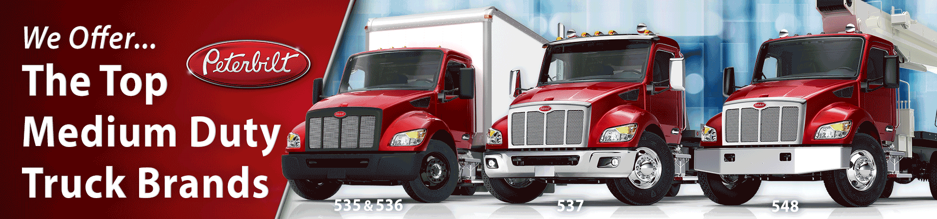 Peterbilt has introduced an All New Medium Duty Family of trucks, Class 5 to Class 8. Versatility has been improved with multiple hood and roof options. These trucks are built for productivity, with great visibility, improved mobility, an improved interior for comfort, and the best in class 7" digital display. The new Medium Duty truck family is built for uptime and efficiency with durable design, improved access point, and the new PACCAR 8-speed TX-8 automatic transmission. Whatever your application, the Peterbilt Medium Duty Trucks are built to show up every day.